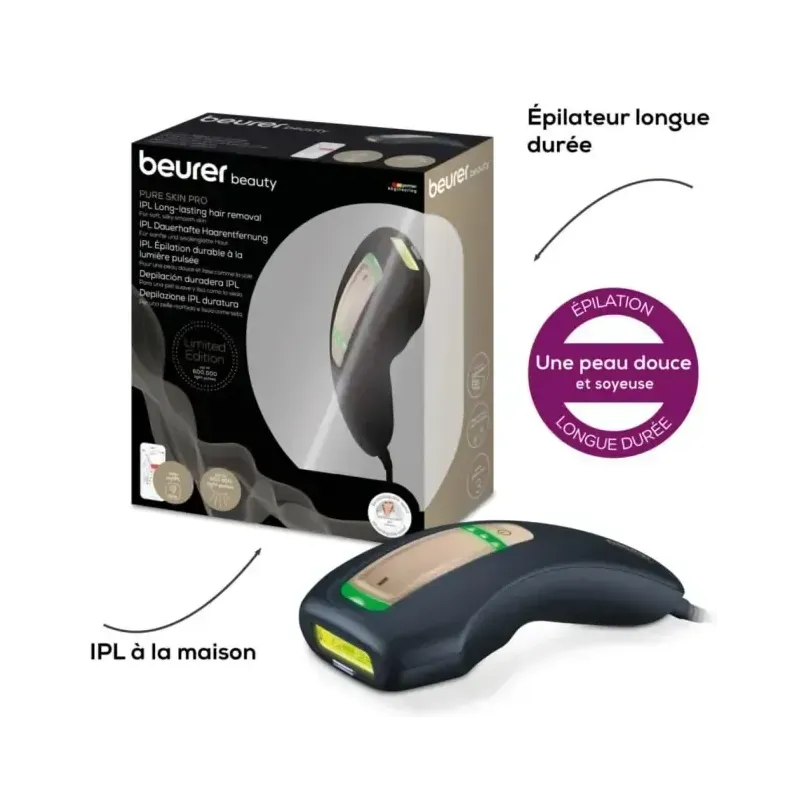 L'épilateur à lumière pulsée Beurer IPL 5800 Pure Skin Pro est un appareil compact pour une épilation longue durée. Il offre 600 000 impulsions lumineuses et une fonction "Auto-Flash", avec un capteur de contact pour un traitement sûr et efficace.