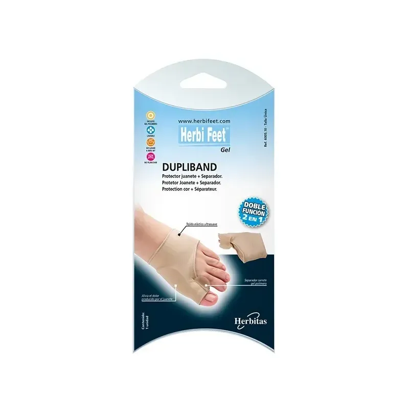 Le HERBI FEET Coussinet Dupliband (Réf: 6005.10) est un dispositif podologique innovant conçu pour offrir une protection et un soulagement ciblés à plusieurs zones sensibles du pied, grâce à sa conception "Dupliband" (double bande) en gel. Ce coussinet est spécifiquement élaboré pour se positionner sous l'avant-pied (zone métatarsienne) tout en intégrant une protection latérale pour le petit orteil (cinquième orteil). Fabriqué à partir d'un gel polymère de haute qualité ou de silicone médical, il est ultra-doux, flexible et s'adapte parfaitement à l'anatomie du pied. Il est idéal pour soulager les douleurs liées aux métatarsalgies (douleurs sous la plante des pieds), aux durillons, cors et ampoules à l'avant-pied, ainsi qu'aux frottements et pressions exercés sur le petit orteil, notamment en cas de bunionette (oignon du petit orteil) ou de chevauchement. Sa conception ergonomique et discrète permet de le porter confortablement dans la plupart des types de chaussures, améliorant significativement le confort de marche au quotidien.