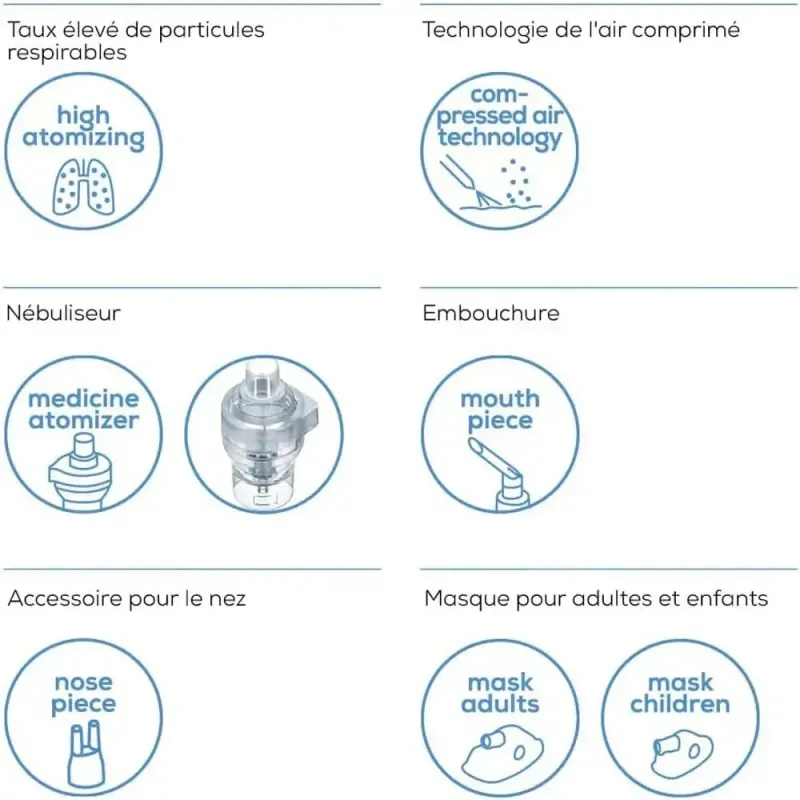Nettoyage : Après chaque utilisation, nettoyez et désinfectez le nébuliseur et les accessoires pour maintenir l'hygiène et la performance.