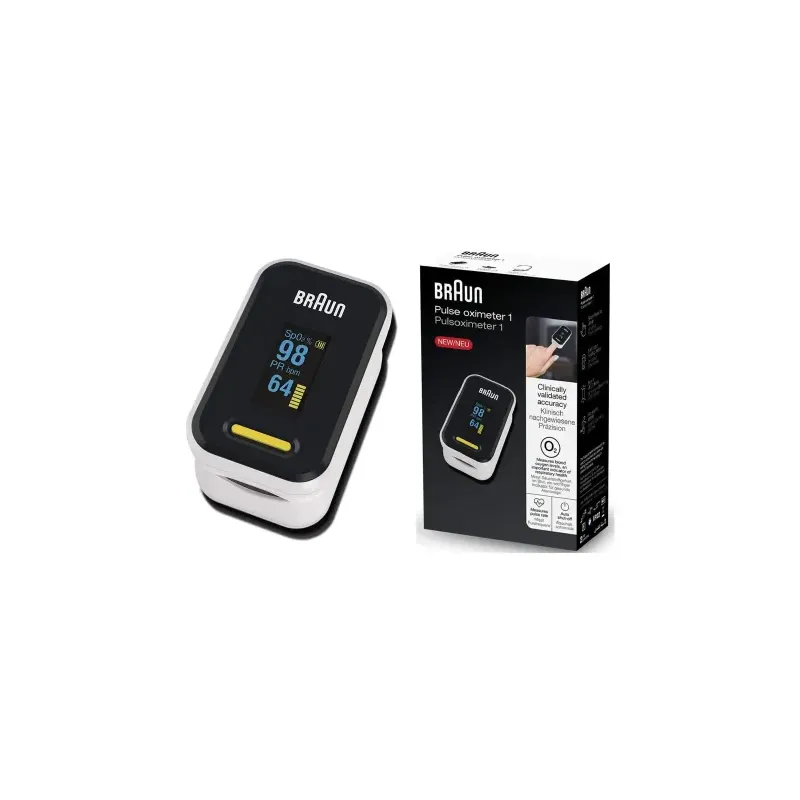 Oxymètre de pouls Braun 1, appareil portable et simple pour la mesure de la saturation en oxygène (SpO_2) et du pouls chez l'adulte, doté d'un écran OLED rotatif pour une lecture claire.