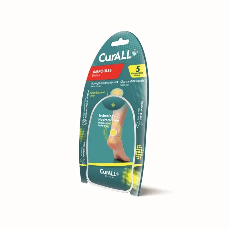 Les Pansements Ampoules Talon CURALL sont des dispositifs hydrocolloïdes spécialement conçus dans une forme anatomique et une grande taille pour couvrir et protéger efficacement les ampoules du talon, la zone la plus fréquemment touchée par les frottements des chaussures. Vendus en boîte de 5 unités, ces pansements utilisent une technologie hydrocolloïde qui absorbe l'excès de liquide de l'ampoule pour créer un gel protecteur. Ils agissent comme une véritable "seconde peau" épaisse, offrant un soulagement immédiat de la douleur en réduisant la pression, et en accélérant la cicatrisation en maintenant un environnement humide optimal.