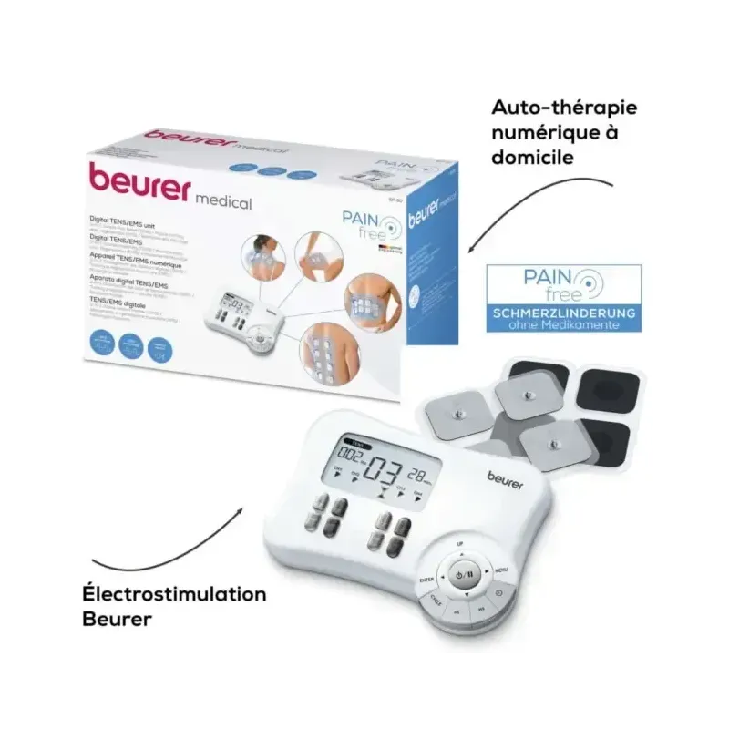 Appareil d'électrostimulation Beurer EM 80 offrant les fonctions TENS et EMS. Il est équipé de 4 canaux et 8 électrodes, propose 50 programmes prédéfinis et est idéal pour le soulagement de la douleur et la stimulation musculaire.