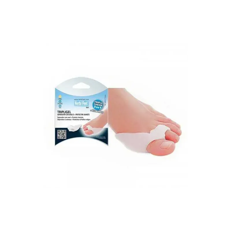 Séparateur d'orteils en gel, triple action, écarte, soulage la pression et amortit les chocs pour le confort des pieds.