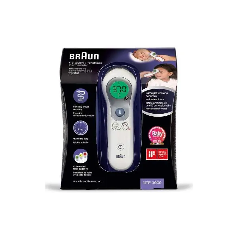 Le Braun Thermomètre Frontal Sans Contact NTF3000 est un dispositif médical conçu pour mesurer la température corporelle avec une extrême douceur et sans nécessiter de contact physique. Il est particulièrement apprécié par les parents, car il permet de prendre la température d'un enfant (ou d'un adulte) sans le réveiller ou le déranger. Il utilise une technologie infrarouge brevetée pour capter la chaleur émise par le front et fournir un résultat rapide et fiable.