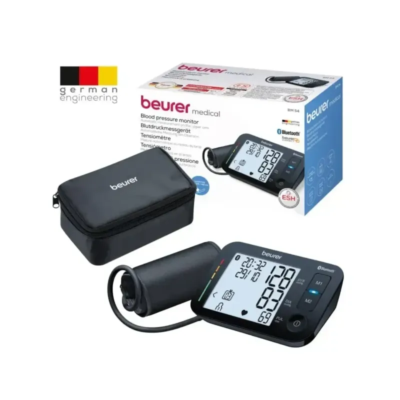 Tensiomètre de bras Beurer BM 54 avec Bluetooth, qui mesure la tension artérielle et le pouls. Il se connecte à l'application "Beurer HealthManager Pro" pour un suivi numérique. Il est doté d'un brassard universel, d'une détection d'arythmie et d'un indicateur de risque OMS.