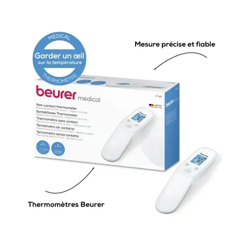 Le thermomètre sans contact Beurer FT 85 est un appareil médical moderne et hygiénique, conçu pour une prise de température rapide et fiable sans toucher la peau. Utilisant la technologie de l'infrarouge, il permet de mesurer la température corporelle sur le front en quelques secondes. Ce thermomètre est idéal pour les bébés et les enfants, car il évite de les réveiller. Il est également polyvalent, capable de mesurer la température d'objets, de liquides et même la température ambiante. Le Beurer FT 85 est doté d'une alarme de fièvre visuelle : une LED rouge s'allume si la température est élevée, ce qui facilite l'interprétation des résultats. Son grand écran rétro-éclairé assure une lecture claire et la fonction de mémoire permet d'enregistrer les 60 dernières mesures pour un suivi précis.