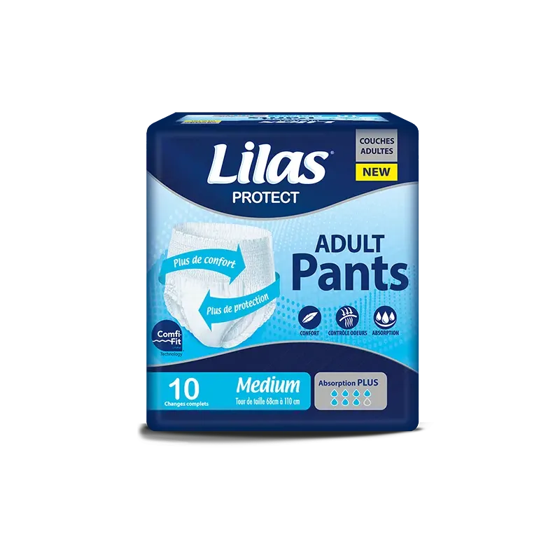 Couches culottes absorbantes LILAS PANTS ADULTE Taille M (paquet de 10), offrent une discrétion et une autonomie optimales pour l'incontinence modérée à forte, avec une haute capacité d'absorption et un confort sous-vêtement.