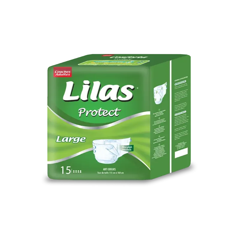 Couches Adulte LILAS CONFORT PROTECT Taille LARGE (paquet de 15), change complet avec attaches adhésives, haute capacité d'absorption pour l'incontinence forte à sévère, assurant confort et respirabilité.