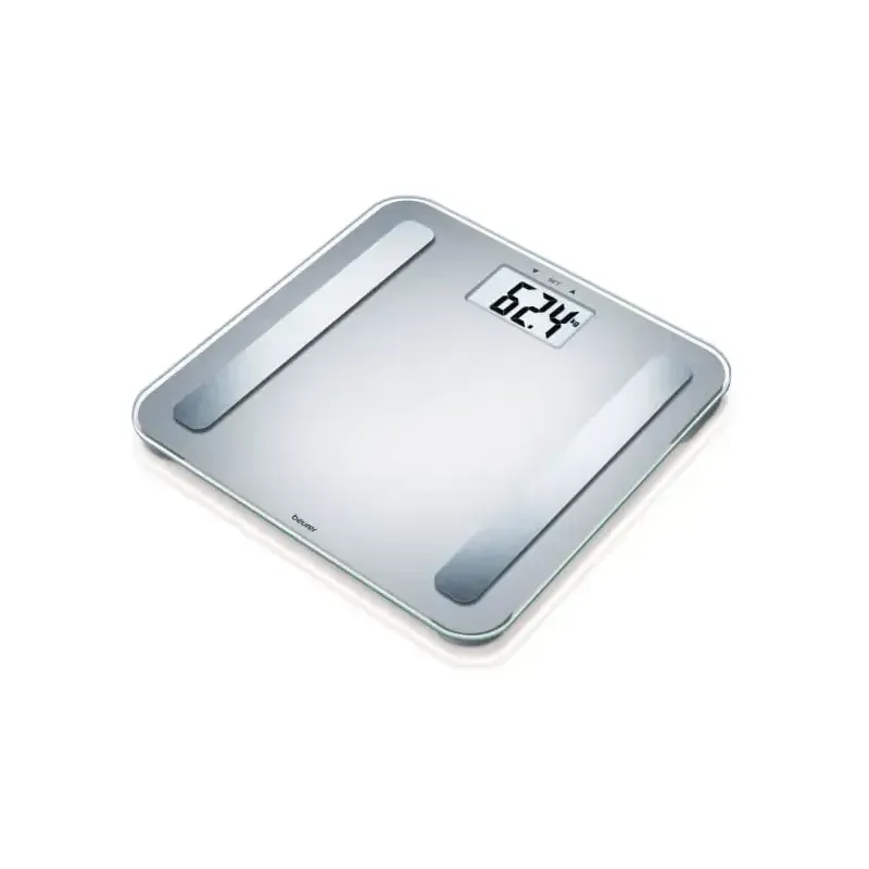 Pèse-personne impédancemètre Beurer BF 183 en verre de sécurité, qui mesure le poids, le taux de graisse, d'eau, de muscle et la masse osseuse, ainsi que l'IMC. Il est doté d'un écran rétro-éclairé et mémorise 10 profils d'utilisateurs.