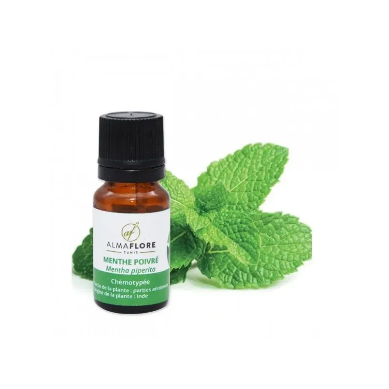 Huile essentielle de Menthe Poivrée (10ml), puissante. Elle est antalgique (migraines), digestive (nausées) et tonifiante. Elle doit être utilisée avec prudence et parcimonie, et est déconseillée aux enfants, femmes enceintes et personnes hypertendues.