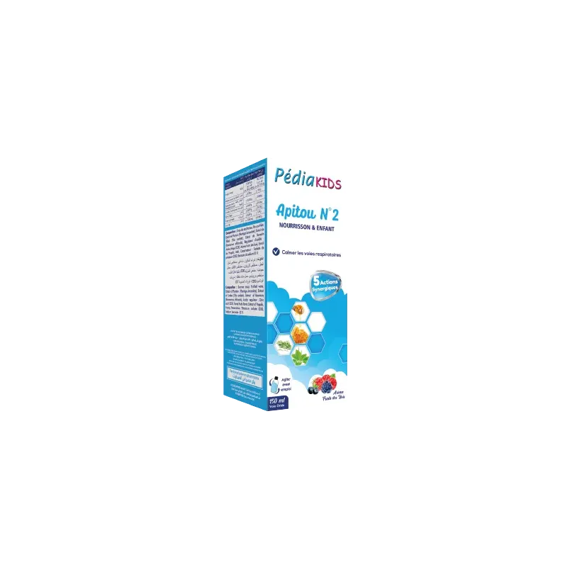 Le Pédiakids Apitou N°2 est un sirop apaisant et naturel destiné à offrir un soulagement aux enfants souffrant de toux sèche et d'irritations des voies respiratoires. Sa formule douce et agréable au goût est spécifiquement adaptée aux jeunes organismes.