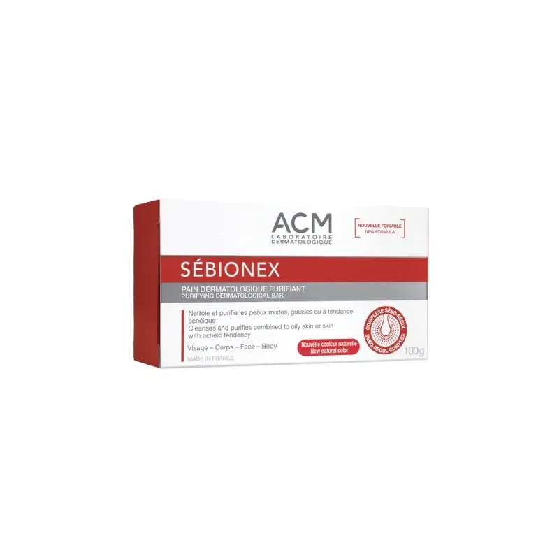 Le ACM Sébionex Pain Dermatologique Purifiant est un nettoyant solide (pain) spécialement formulé pour l'hygiène quotidienne des peaux mixtes, grasses et à problèmes (imperfections, acné, brillances), aussi bien sur le visage que sur le corps. Il a été développé pour nettoyer la peau en profondeur sans la dessécher ni l'agresser.