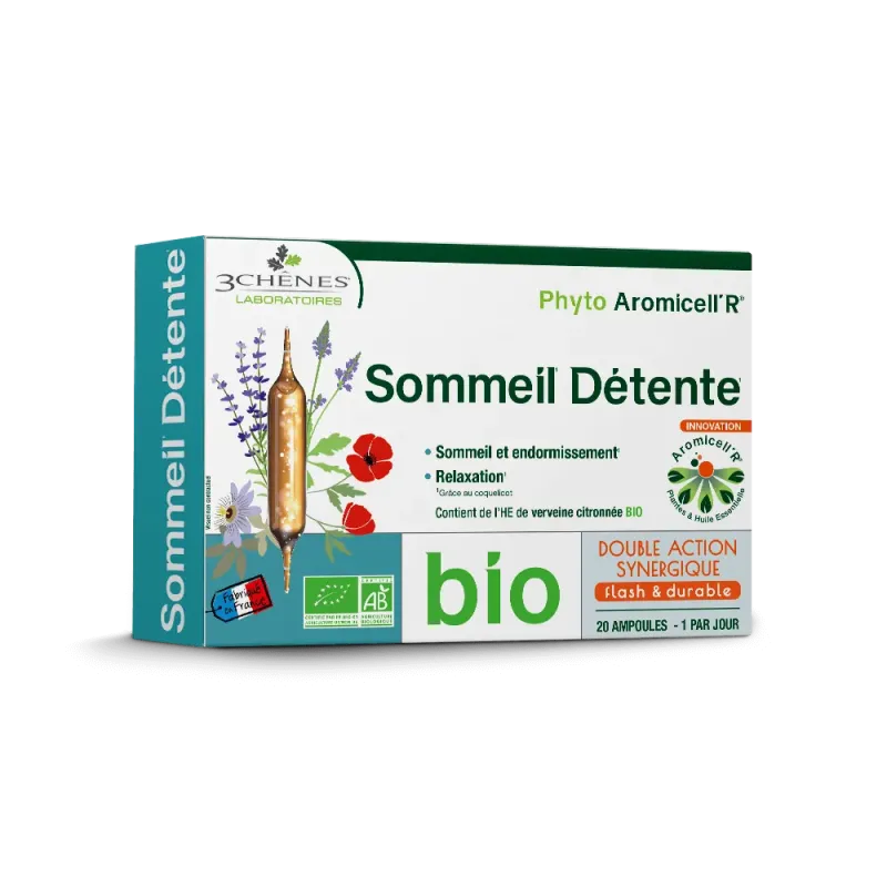 Un complément alimentaire sous forme d'ampoules buvables, conçu pour favoriser un bon sommeil et la relaxation.