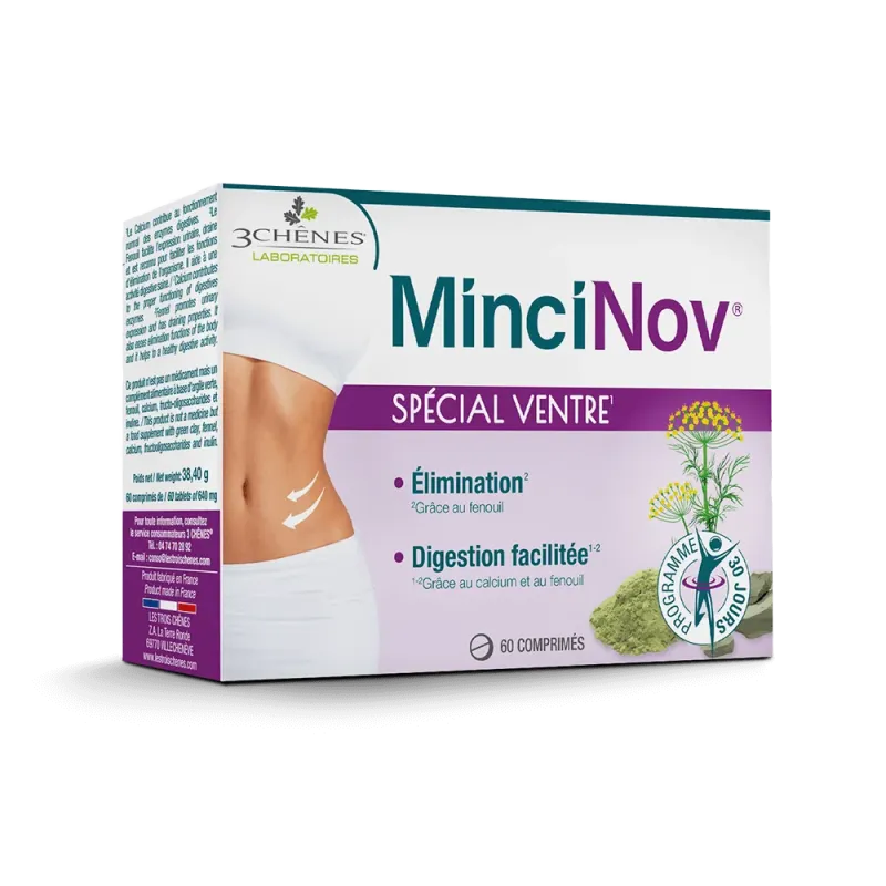 3 CHENES MINCINOV SPÉCIAL VENTRE 60 COMPRIMÉS est un complément alimentaire du laboratoire Les 3 Chênes, spécifiquement formulé pour cibler le confort digestif et contribuer à un ventre plus plat en réduisant les ballonnements.