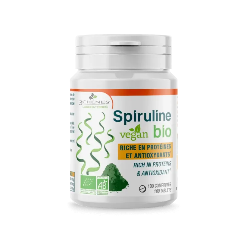 3 CHENES BIO SPIRULINE BIOLOGIQUE 100 COMPRIMES est un complément alimentaire à base de spiruline certifiée biologique, reconnu pour sa richesse en nutriments et ses multiples bienfaits pour la vitalité et la santé générale.