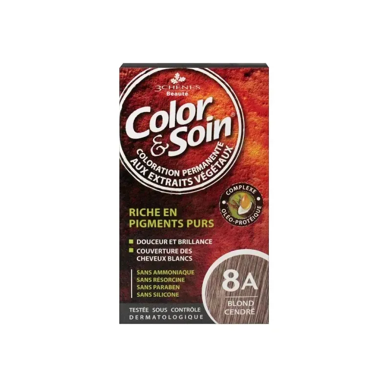 3 CHENES COLOR & SOIN COLORATION BLOND CENDRÉ 8A est une coloration capillaire permanente formulée à base d'extraits végétaux. Elle est conçue pour teindre les cheveux en couvrant 100% des cheveux blancs dès la première application, tout en les protégeant et en les soignant.