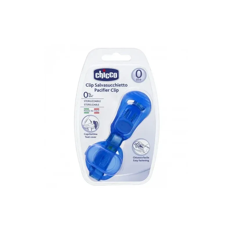 attache-sucette Chicco avec couvercle intégré, référence 72631 et de couleur bleue, est un accessoire pratique et hygiénique conçu pour les parents de bébés. Il permet de garder la sucette de votre enfant propre, à portée de main et sécurisée.
