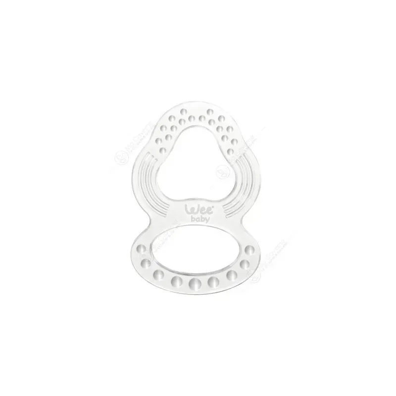 Un anneau de dentition de la marque Wee Baby, spécifiquement conçu pour soulager les gencives douloureuses et irritées des bébés durant la période de poussée dentaire. Identifié par la référence 858, cet anneau est fabriqué entièrement en silicone pur, offrant une solution sûre, hygiénique et efficace pour le confort de bébé.