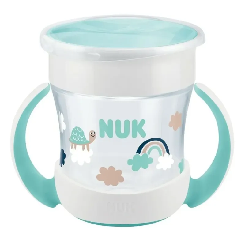 La tasse est dotée de poignées ergonomiques conçues pour une prise en main facile et intuitive, même pour les plus petits doigts. Pour maintenir l'hygiène lors des déplacements, un couvercle de protection est inclus. La NUK Mini Magic Cup est également simple à démonter et à nettoyer, avec peu de pièces individuelles, ce qui la rend pratique pour les parents. Elle est souvent décorée de jolis motifs colorés qui attirent l'attention des bébés.