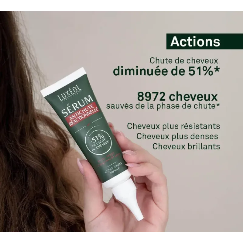 Un sérum anti-chute réactionnel Luxéol 50ml qui diminue la chute de cheveux soudaine liée au stress ou à la fatigue, stimule la croissance et renforce la fibre capillaire pour des cheveux plus denses et résistants.