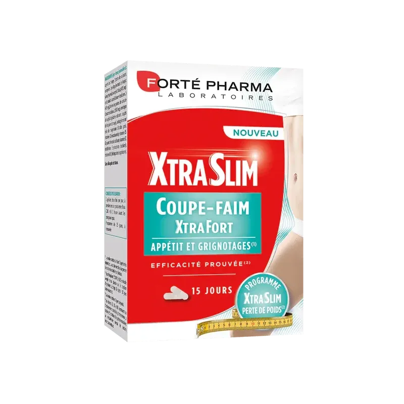 Forté Pharma XtraSlim Coupe Faim aide à réduire l'appétit et les envies de grignotage. Il augmente la sensation de satiété grâce à des fibres gonflantes comme le Konjac (glucomannane). Il diminue l'apport calorique des repas. Il est enrichi en vitamines B pour soutenir le métabolisme énergétique.