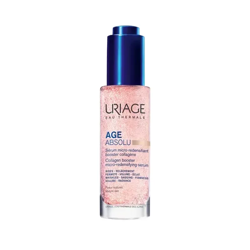 Le Uriage Age Absolu Sérum Micro-Redensifiant Booster Collagène 30 ml est un sérum anti-âge global qui cible et corrige les 10 signes du vieillissement sur les peaux matures, même sensibles. Sa texture unique, eau-huile encapsulée avec des microsphères lipophiles, assure une absorption optimale et une sensation légère. Il agit en profondeur pour redensifier, repulper, raffermir et lisser la peau, révélant un teint plus jeune et lumineux. Ce sérum adresse la perte de collagène grâce à un double boost de collagène : des Microsphères Booster Collagène et un Peptide Procollagène, qui peuvent multiplier le niveau de collagène jusqu'à 6 fois. La formule est enrichie de Rétinol pour le renouvellement cellulaire, d'Acide Hyaluronique pour l'hydratation intense, de Vitamines C et E comme antioxydants et pour l'éclat, de l'Eau Thermale d'Uriage pour ses propriétés apaisantes, et du Brevet Telomeres Protect contre le vieillissement cellulaire. Le sérum agit sur les rides, le relâchement, la perte de fermeté, de volume, de densité, d'élasticité, la sécheresse, le manque d'éclat, les taches et le manque de confort. Testé sous contrôle dermatologique, il convient à toutes les peaux matures, y compris sensibles, et est non comédogène.