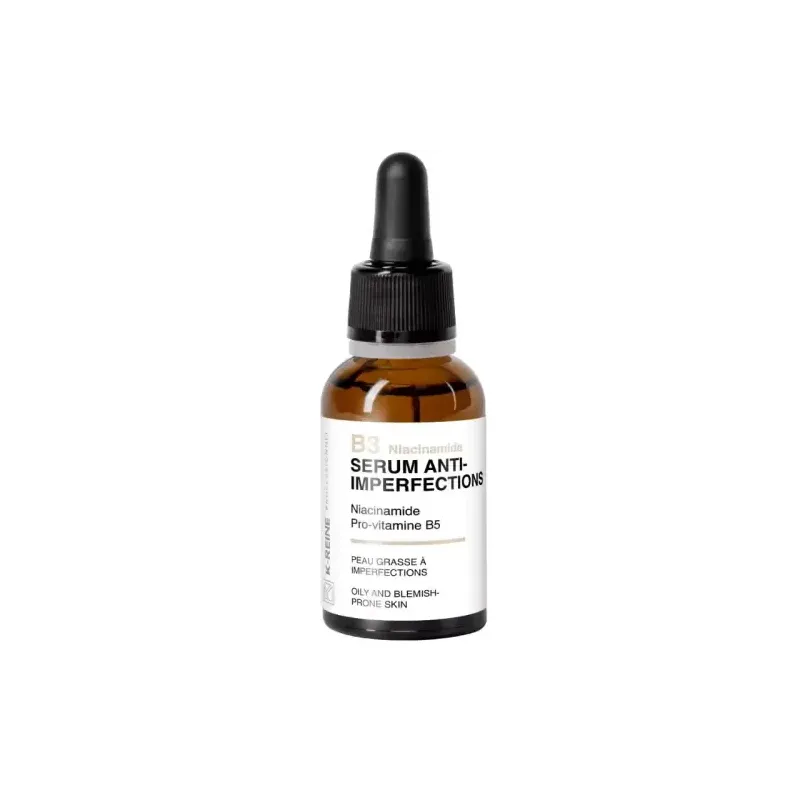 Le K-REINE Sérum Anti-Imperfections réduit visiblement les imperfections (boutons, points noirs). Il resserre les pores dilatés et affine le grain de peau. Il diminue les rougeurs et uniformise le teint. Il est enrichi en Niacinamide (Vitamine B3) à une concentration efficace. Il renforce la barrière cutanée et apaise la peau. Sa formule est légère, non grasse et non comédogène. Le format pipette de 30ml est pratique et hygiénique.