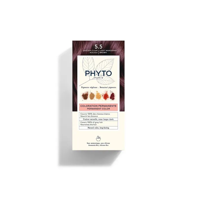 La coloration Phyto Phytocolor 5.5 Châtain Clair Acajou est une coloration permanente aux pigments végétaux, conçue pour couvrir 100% des cheveux blancs dès la première application tout en respectant la fibre capillaire et le cuir chevelu. Cette teinte spécifique offre un châtain clair enrichi de reflets acajous chauds et intenses.