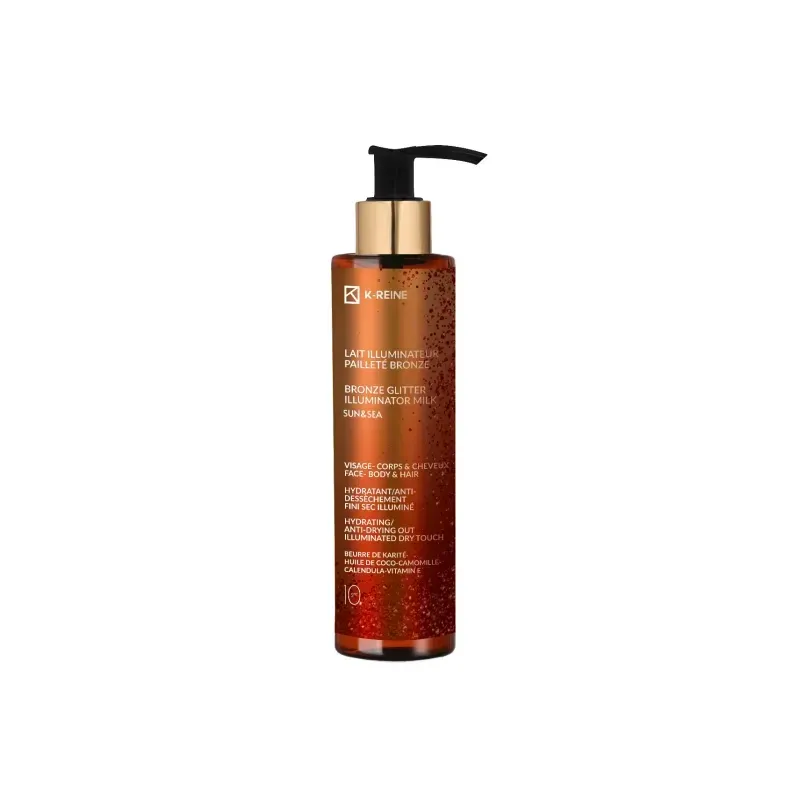 Ce lait illuminateur de K-REINE est une formule hybride qui allie les bienfaits d'un soin hydratant à l'éclat d'un sublimateur de teint. Il est conçu pour apporter une touche de lumière bronze irisée à votre peau et à vos cheveux, tout en offrant une hydratation essentielle et une légère protection solaire.