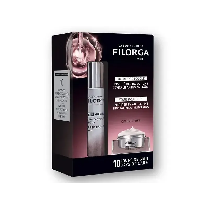 Ce coffret FILORGA combine deux soins essentiels de la gamme NCEF-REVERSE, offrant une approche globale pour revitaliser la peau et combattre les signes de l'âge, avec un format découverte offert.
