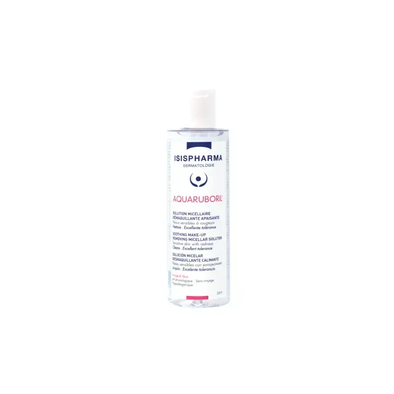 L'ISISPHARMA AQUARUBORIL SOLUTION MICELLAIRE DÉMAQUILLANTE 250ML est une eau micellaire purifiante, démaquillante et apaisante spécialement formulée pour les peaux sensibles, réactives et sujettes aux rougeurs (érythrose, couperose, rosacée). Ce flacon de 250 ml est parfait pour un usage quotidien, offrant un nettoyage doux et efficace sans agresser la peau fragile.