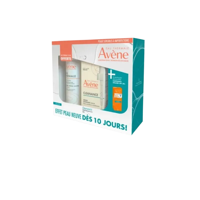 Le PACK AVENE CLEANANCE SÉRUM EXFOLIANT A.H.A est un ensemble de soins ciblant spécifiquement les peaux sensibles à tendance acnéique, les imperfections (boutons, points noirs), les marques résiduelles et le grain de peau irrégulier. Le composant principal de ce pack est le Sérum Exfoliant A.H.A. de 30ml, souvent accompagné d'un format complémentaire (souvent un petit tube de gel nettoyant Cleanance, comme un format de 15ml, pour une routine complète).