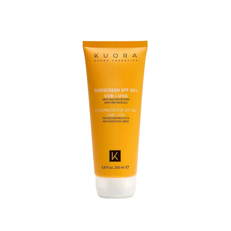 L'KUORA ECRAN SOLAIRE VISAGE ET CORPS SPF50+ est un soin de très haute protection solaire présenté en flacon de deux cents millilitres. Il est formulé pour offrir une protection maximale contre les effets néfastes du soleil, avec un indice de protection très élevé SPF cinquante plus et des filtres photostables à large spectre protégeant contre les rayons UVA et UVB. Sa formulation intègre des filtres physiques (Dioxyde de Titane) et chimiques, souvent délivrés via une technologie liposomale pour une action au cœur de l'épiderme et une longue durée. Cet écran solaire protège également du photovieillissement, prévient l'apparition des taches pigmentaires (masque de grossesse, photosensibilisation) et les dommages cellulaires, notamment grâce à la présence d'antioxydants comme la Vitamine E. Sa texture est un lait velouté, non gras, sans traces blanches, qui pénètre rapidement, et il est conçu pour une haute tolérance.