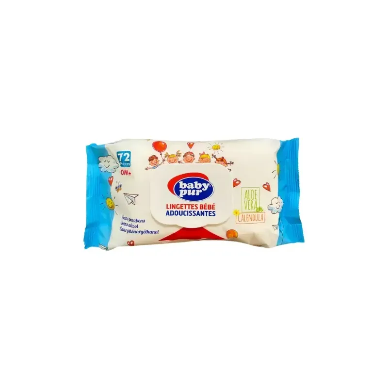 Ces lingettes bébé adoucissantes BABY PUR (72 pièces) sont conçues pour la peau délicate des nouveau-nés (0M+). Leur formule hypoallergénique, sans alcool ni paraben, nettoie et hydrate en douceur, offrant une solution pratique et sûre pour le change et la toilette quotidienne de bébé.