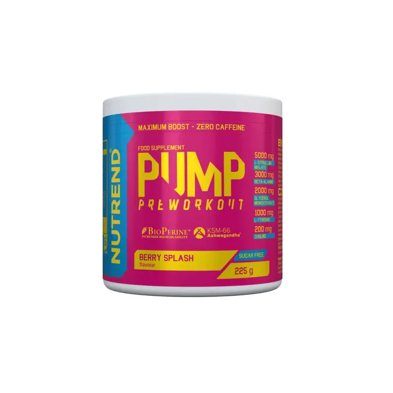 Le NUTREND PUMP PRE WORKOUT Berry Splash 225g est un complément pré-entraînement conçu pour maximiser vos performances, votre énergie et la "pompe" musculaire durant l'exercice. Formulé avec un mélange d'ingrédients clés, il vise à offrir une expérience d'entraînement intense et ciblée. Ce complément combine plusieurs composés actifs qui agissent en synergie pour préparer votre corps à une activité physique exigeante.