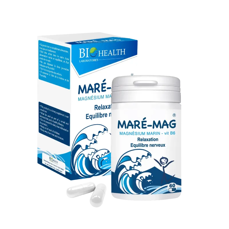 Les gélules Mare Mag de Biohealth sont un complément alimentaire formulé pour apporter à l'organisme une source de magnésium marin, un minéral essentiel au bon fonctionnement du corps. Le magnésium marin est réputé pour sa haute biodisponibilité, ce qui signifie qu'il est facilement assimilé par l'organisme. Ce complément est conçu pour aider à réduire la fatigue et le stress, favoriser la détente et l'équilibre nerveux, et contribuer au maintien de la fonction musculaire normale. Il est enrichi en vitamine B6, qui est essentielle pour la bonne absorption du magnésium par les cellules, et qui joue un rôle crucial dans le fonctionnement normal du système nerveux.