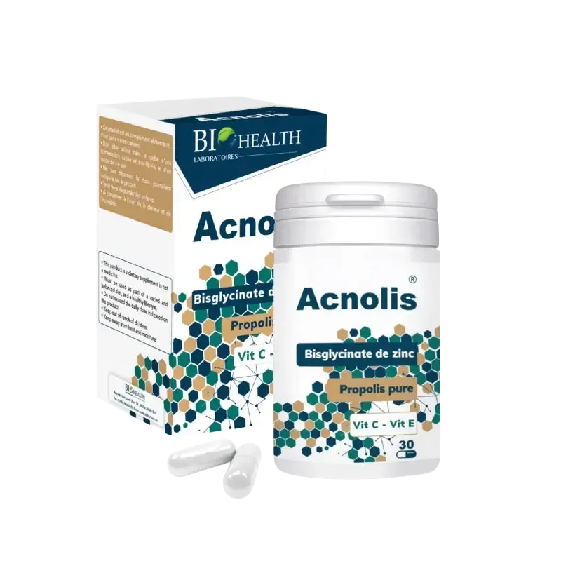 Les gélules Acnolis de Biohealth sont un complément alimentaire formulé pour cibler les problèmes de peau, en particulier l'acné, la dermatite ou le psoriasis. Sa composition est un concentré d'actifs essentiels qui agissent de l'intérieur pour assainir et réguler l'épiderme. Le zinc bisglycinate, sous une forme hautement biodisponible, régule la production de sébum, un facteur clé dans l'apparition des imperfections. Le complément est également enrichi en propolis, un ingrédient naturel reconnu pour ses propriétés purifiantes et apaisantes. Les vitamines C et E complètent la formule en apportant une action antioxydante puissante qui protège les cellules cutanées du stress oxydatif, responsable du vieillissement prématuré et de l'inflammation. En plus de ses bienfaits sur la peau, ce complément contribue à la santé des cheveux et des ongles et renforce le système immunitaire.