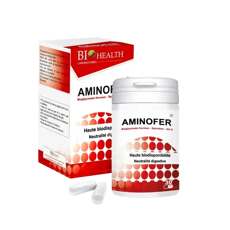 Les gélules Amino Fer de Biohealth sont un complément alimentaire conçu pour lutter contre les états de fatigue liés à un manque de fer. Le fer est un minéral essentiel qui joue un rôle crucial dans le transport de l'oxygène dans le sang, contribuant ainsi à la vitalité et au bon fonctionnement de l'organisme. Ce produit est formulé avec du fer bisglycinate, une forme de fer hautement biodisponible et généralement mieux tolérée sur le plan digestif que d'autres formes de fer. Il est souvent associé à de la vitamine C, qui est indispensable pour une absorption optimale du fer. L'ajout de vitamines du groupe B (B6, B9, B12) complète cette formule en agissant en synergie pour réduire la fatigue et soutenir la formation des globules rouges. Amino Fer est idéal pour les personnes souffrant de fatigue, de pâleur, ou ayant des besoins accrus en fer (femmes enceintes, sportifs, végétariens).