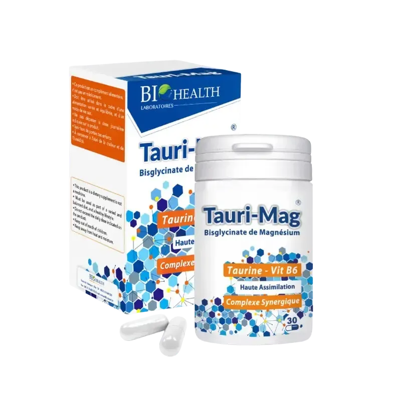 Les gélules Tauri Mag de Biohealth sont un complément alimentaire formulé pour réduire la fatigue, le stress et favoriser l'équilibre nerveux. Ce produit est une synergie de taurine, de magnésium marin et de vitamine B6, trois nutriments essentiels qui agissent de concert pour soutenir le système nerveux et le métabolisme énergétique. Le magnésium est un minéral crucial pour le bon fonctionnement des muscles et la transmission nerveuse. Associé à la taurine, il contribue à la relaxation et à la diminution des états de stress et d'anxiété. La vitamine B6 complète cette formule en facilitant l'absorption du magnésium par l'organisme et en participant à la réduction de la fatigue. Tauri Mag est idéal pour les personnes soumises à une période de stress, de surmenage ou de fatigue intense.