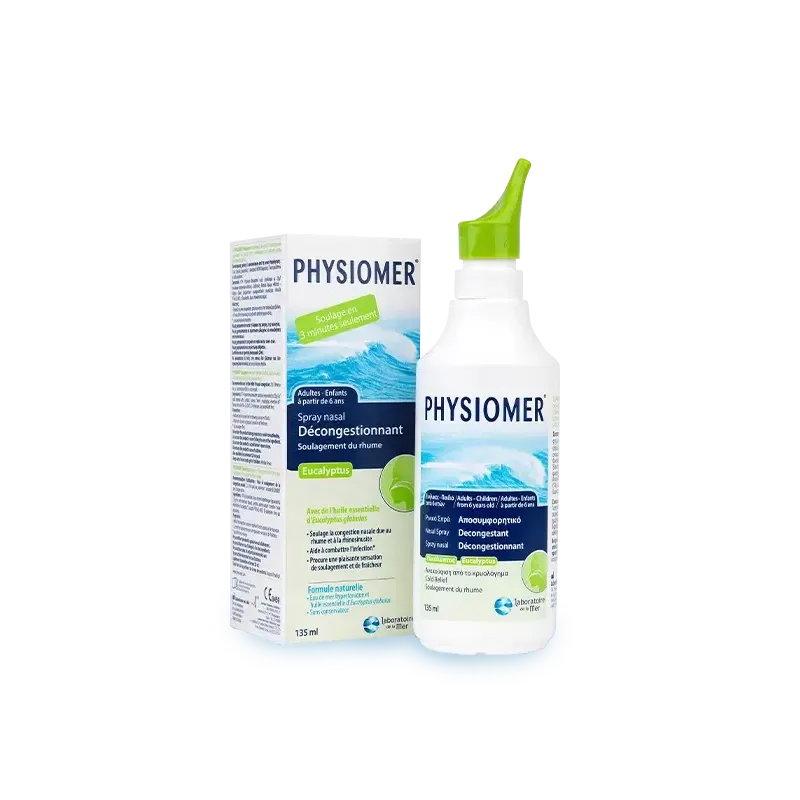 PHYSIOMER Eucalyptus Spray est une solution nasale 100 % naturelle, conçue pour soulager rapidement le nez bouché et les symptômes du rhume et de la sinusite. Sa formule hypertonique associe de l'eau de mer non diluée à des huiles essentielles d'Eucalyptus et de Niaouli, ainsi qu'à un extrait naturel de Menthe. Cette synergie d'ingrédients décongestionne efficacement les voies nasales, tout en procurant une sensation de fraîcheur immédiate. Il contribue également à purifier et à nettoyer les fosses nasales des agents infectieux et allergènes.