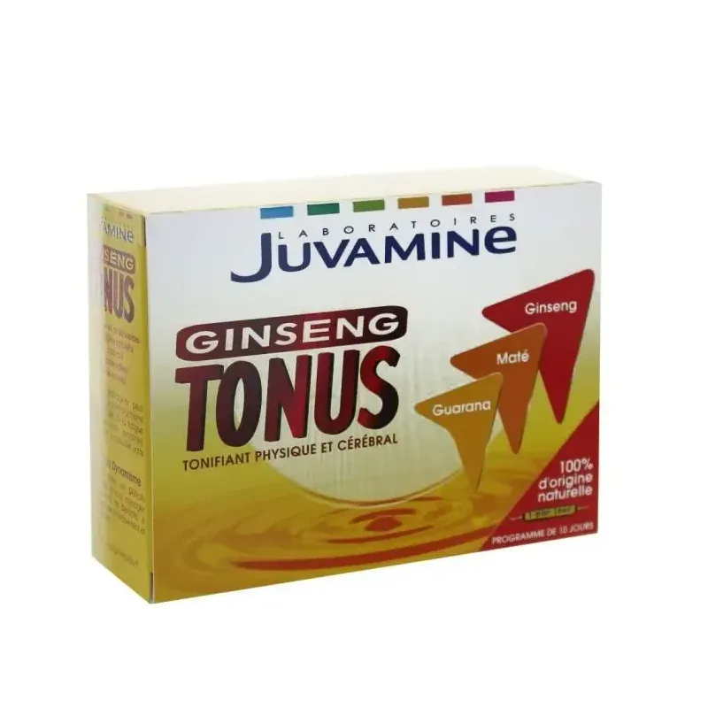 Complément alimentaire en ampoules à base de ginseng. Il aide à combattre la fatigue physique et mentale, booste la vitalité et soutient les performances intellectuelles pour un regain d'énergie rapide et efficace.