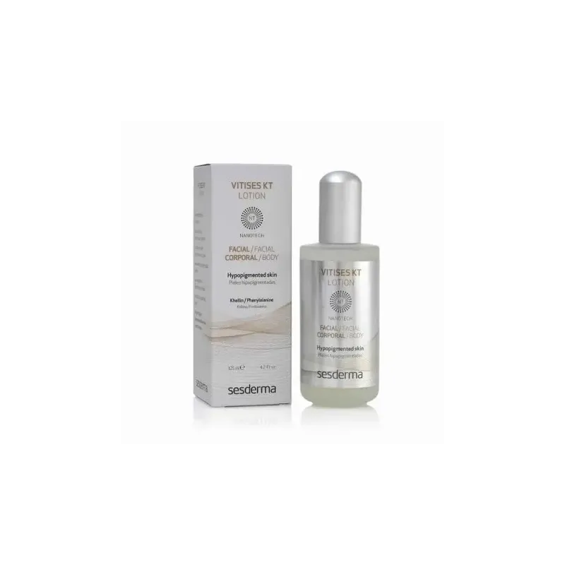 La SESDERMA VITISES KT LOTION est un soin dermatologique formulé spécifiquement pour les peaux présentant une dépigmentation ou des taches blanches, comme celles dues au vitiligo. Cette lotion agit en tant que traitement complémentaire pour aider à réduire la différence de pigmentation. Sa formule innovante utilise une combinaison d'ingrédients encapsulés dans des nanosomes, une technologie de pointe qui assure une pénétration optimale et une efficacité accrue. En stimulant la synthèse de la mélanine, elle contribue à repigmenter les zones affectées et à unifier le teint de la peau.