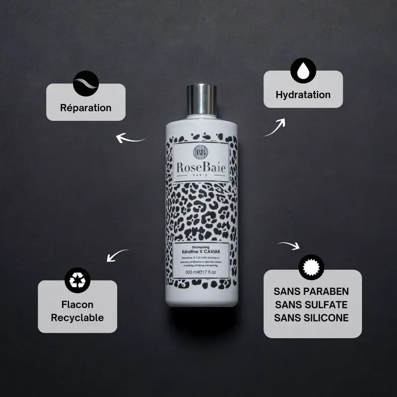 Le shampoing Kératine x Caviar de RoseBaie est un soin capillaire d'exception, conçu pour un traitement de luxe des cheveux en manque de vitalité, abîmés ou matures. Ce shampoing associe les bienfaits de la kératine, ingrédient essentiel de la fibre capillaire, à l'élixir précieux du caviar, reconnu pour ses propriétés nutritives et anti-âge. Sa formule douce et riche nettoie délicatement tout en agissant en profondeur pour revitaliser, renforcer et protéger la chevelure des agressions extérieures. Les cheveux retrouvent souplesse, brillance et vitalité, avec un effet anti-âge visible.