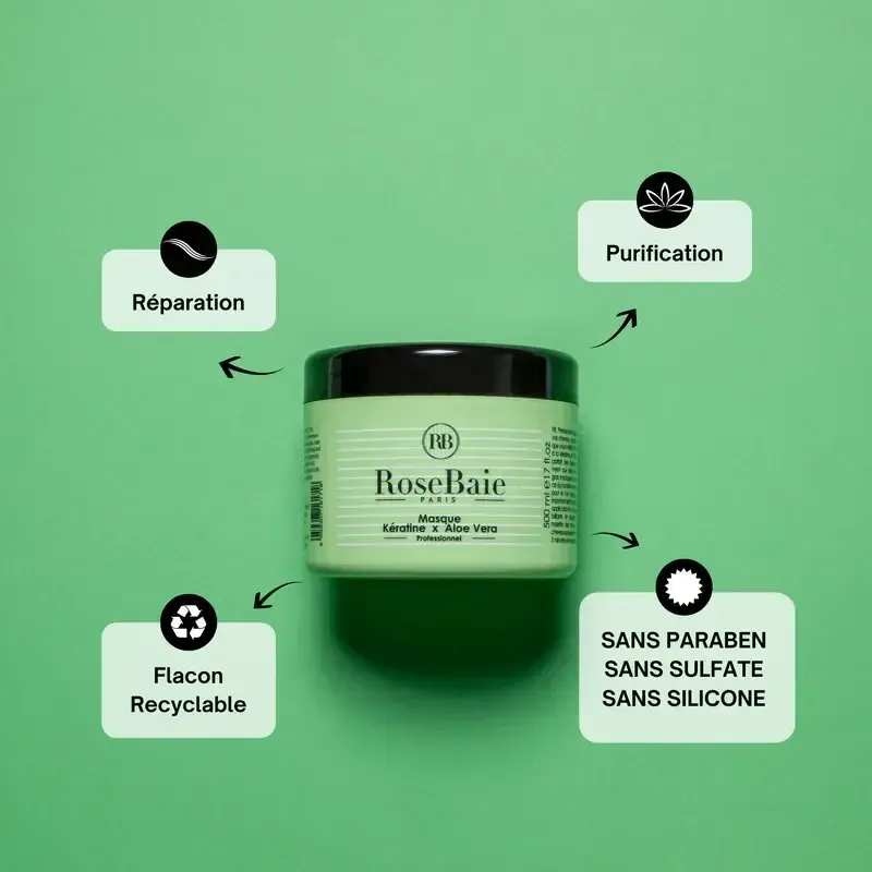 Ce masque est un soin capillaire intensif formulé pour hydrater en profondeur et réparer les cheveux secs, déshydratés ou abîmés. Sa formule riche et crémeuse allie les bienfaits de la kératine, un ingrédient essentiel de la fibre capillaire, aux vertus hydratantes et apaisantes de l'aloe vera. Ce masque agit en profondeur pour restaurer l'équilibre hydrique du cheveu, tout en renforçant sa structure de l'intérieur. Il apporte une douceur et une souplesse incomparables, réduit les frisottis et améliore la brillance. Le résultat est une chevelure visiblement plus saine, plus forte et pleine de vitalité.