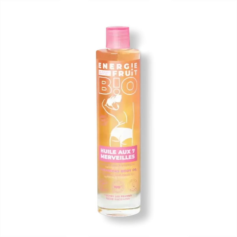 L'Huile aux 7 Merveilles Bio d'Énergie Fruit est un soin multi-usages conçu pour nourrir et sublimer la peau et les cheveux. Sa formule, composée à 100% d'ingrédients d'origine naturelle, est un cocktail de 7 huiles végétales biologiques, dont l'argan, le coco, le karité et l'huile de macadamia. Cette huile sèche pénètre rapidement sans laisser de film gras, et offre une hydratation intense tout en luttant contre le dessèchement. Elle nourrit en profondeur, répare et protège la peau et les cheveux, les laissant doux, souples et délicatement parfumés. Son odeur subtile et agréable en fait un allié beauté idéal au quotidien.