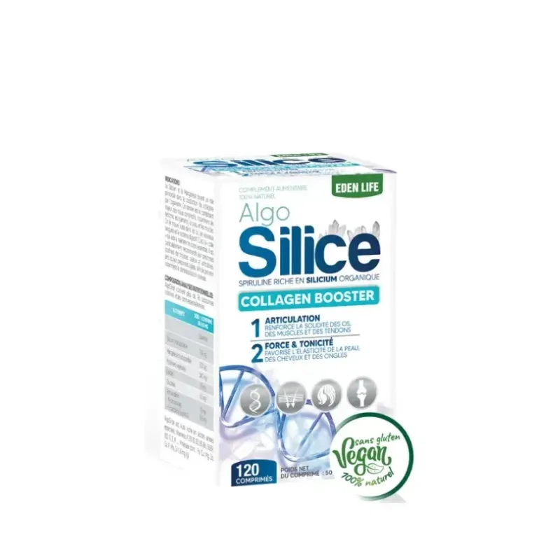 EDEN LIFE ALGO SILICE COLLAGEN BOOSTER est un complément alimentaire sous forme de comprimés, conçu pour soutenir la production naturelle de collagène par l'organisme. Sa formule innovante repose sur une association synergique de trois ingrédients clés : le silicium organique, l'acide hyaluronique et le collagène amino-complexé avec de la spiruline. Le silicium, extrait de l'algue Lithothamnium calcareum, est un oligo-élément essentiel à la synthèse du collagène et à la santé des tissus conjonctifs. L'acide hyaluronique contribue à l'hydratation et à la souplesse de la peau. Enfin, le collagène amino-complexé avec de la spiruline garantit une haute biodisponibilité, permettant une meilleure assimilation par le corps pour une efficacité optimale.