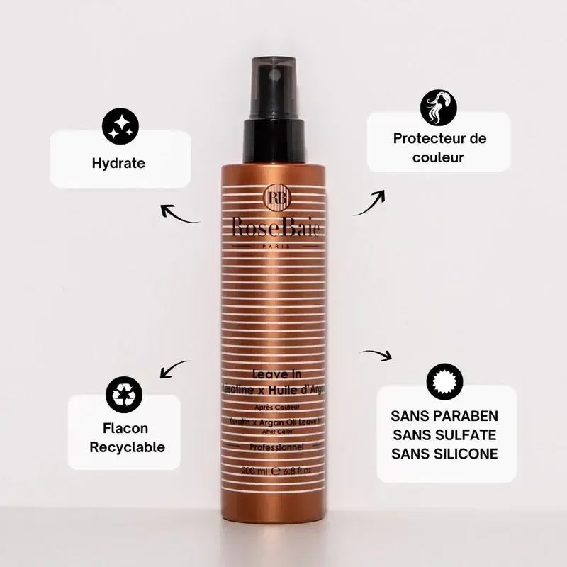 Le spray sans rinçage ROSEBAIE LEAVE IN SPRAY ARGAN POST COLORATION ANTI OXYDANT & PROTECTION 200ML est un soin capillaire spécialement conçu pour protéger et sublimer les cheveux colorés. Sa formule légère et non grasse, enrichie en huile d'argan et en actifs anti-oxydants, agit comme un bouclier quotidien contre les agressions extérieures et le processus d'oxydation qui ternit la couleur. Pratique et rapide à utiliser, il nourrit, démêle et protège la fibre capillaire sans alourdir les cheveux. Ce soin, sans rinçage, prolonge la tenue et l'éclat de la coloration, tout en apportant brillance et douceur.