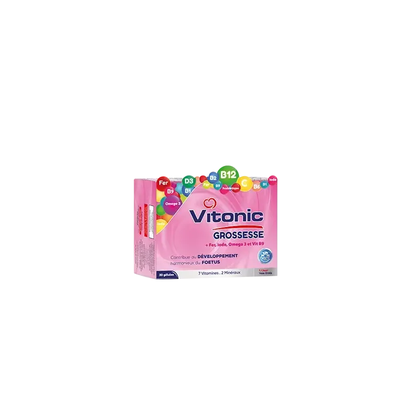 VITAL VITONIC GROSSESSE 30 GÉLULES est un complément alimentaire spécialement formulé pour les femmes enceintes et allaitantes. Sa formule complète associe des vitamines et des minéraux essentiels qui sont d'une importance capitale pendant ces périodes cruciales. Il contient notamment des éléments clés comme le fer, l'acide folique (vitamine B9), et d'autres nutriments pour répondre aux besoins accrus de la mère et assurer le développement optimal du fœtus ou du nourrisson.
