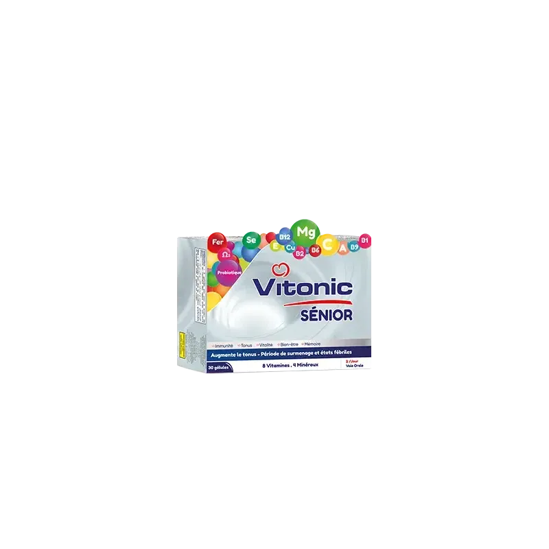 VITAL VITONIC SENIOR 30 GÉLULES est un complément alimentaire spécialement formulé pour répondre aux besoins nutritionnels des personnes de plus de 50 ans. Sa formule complète associe des vitamines, des minéraux, des oligo-éléments et des extraits de plantes pour maintenir la vitalité et le bien-être général. En ciblant les fonctions vitales qui peuvent s'affaiblir avec l'âge, ce produit aide à soutenir la mémoire, l'énergie et le système immunitaire, pour une qualité de vie optimale.