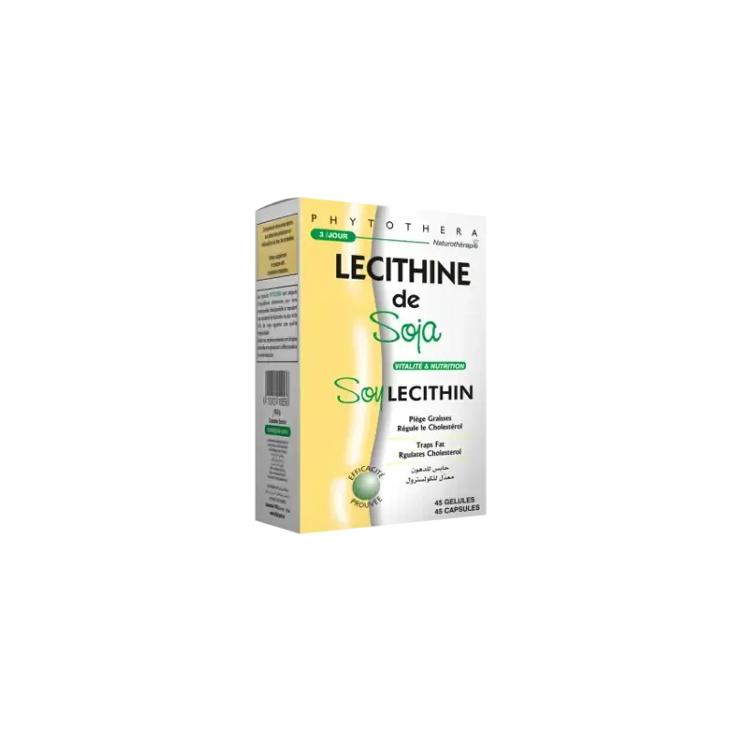 VITAL PHYTOTHERA LÉCITHINE DE SOJA 45 GÉLULES est un complément alimentaire naturel, riche en lécithine de soja. La lécithine est un phospholipide, un type de lipide essentiel à la structure et au bon fonctionnement des cellules de l'organisme. Elle est particulièrement reconnue pour son rôle dans le métabolisme des graisses et du cholestérol. Ce produit est un allié précieux pour les personnes qui souhaitent maintenir une bonne santé cardiovasculaire, soutenir les fonctions cognitives et favoriser le bien-être général.